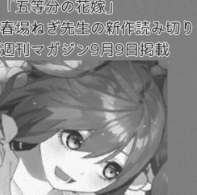 En las últimas horas ha circulado el rumor de que el manga Go-Toubun no Hanayome tendrá un capítulo especial, aunque esto se trata de una confusión. En realidad, Negi Haruba, autor del manga de las quintillizas, lanzará un One Shot que saldrá junto al número 41 de la revista Weekly Shonen Magazine, programado para lanzarse el 9 de septiembre.