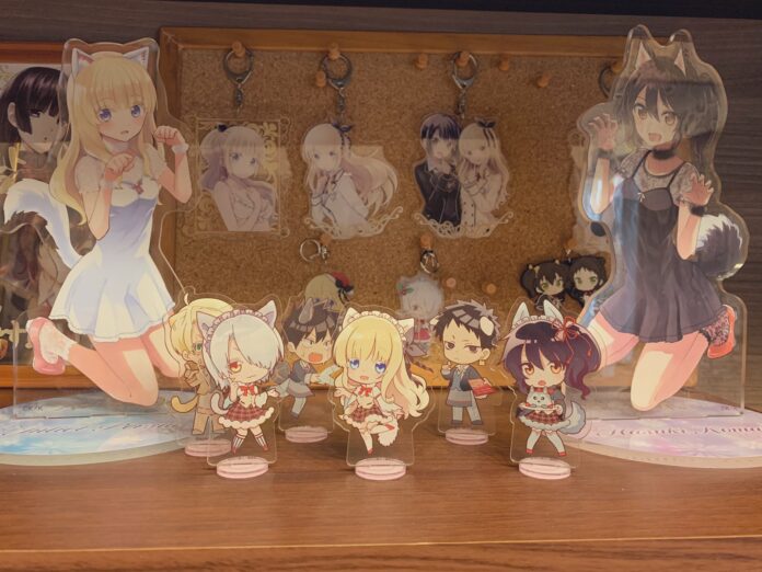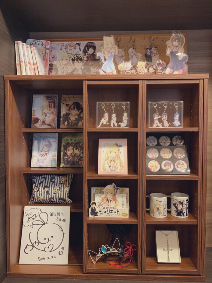 Ademรกs, Yosuke Kanedaย compartiรณ fotografรญas de los estantates que destacan por guardar merchandising de Kishuku Gakkou no Juliet; perteneciente a eventos y colaboraciones exclusivas que estuvieron disponibles solo por tiempo limitado.