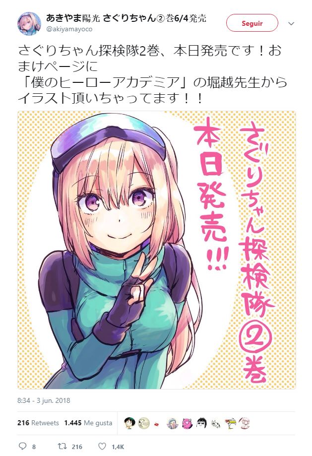 Si bien Horikoshi es responsable de la mayor parte del trabajo del manga, sí recibe ayuda de los asistentes, incluida Yoko Akiyama . Cuando no está ayudando con Boku No Hero Academia , Akiyama trabaja en su propio manga, titulado Saguri-chan Tankentai. El segundo volumen del manga acaba de salir y Horikoshi está pidiendo a sus fans que la apoyen. También dibujó una imagen de colaboración con Deku que aparecerá en el volumen.