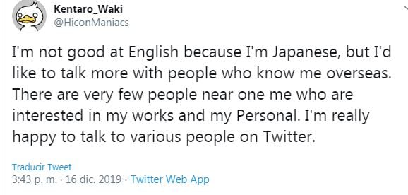 «No soy bueno en inglés porque soy japonés, pero quiero hablar más con personas que me conocen en el extranjero. Hay muy pocas personas cercanas a mí que estén interesadas en mi trabajo y mi gente. Estoy muy feliz de chatear con varias personas en Twitter «.
