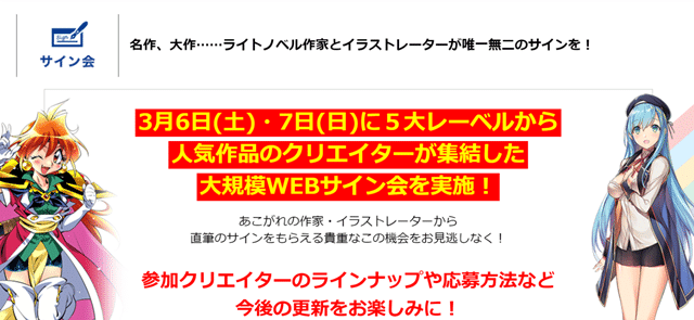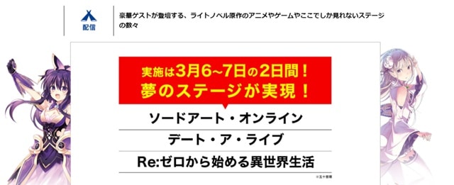 Los días 6 y 7 de marzo, se celebrarán en este último eventos especiales para Sword Art Online (Dengeki Bunko), Date A Live (Fujimi Fantasia Bunko), y Re:Zero – Starting Life in Another World (MF Bunko J) y se retransmitirán en Nico Nico, Periscope, y YouTube Live (no se permitirá la entrada al público).