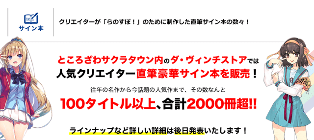 Además, más de 2.000 libros autografiados por escritores populares, con más de 100 títulos en total, se venderán en la tienda Da Vinci de la ciudad de Tokorozawa Sakura. Los detalles de la alineación de libros y los métodos de compra se anunciarán en el sitio web oficial en breve.