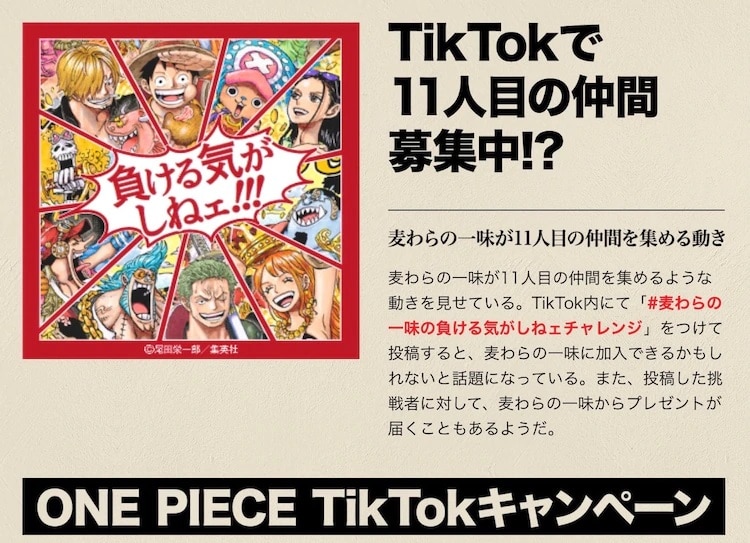 La campaña a través de TikTok se realizará para seleccionar a 10 afortunados ganadores por medio de una lotería. Todos los concursantes deberán subir videos utilizando algunos efectos habilitados sobre One Piece y usar el hashtag #麦わらの一味の負ける気がしねェチャレンジ a partir de hoy y hasta el próximo 18 de febrero. Los ganadores obtendrán una réplica original de algunos dibujos del manga.