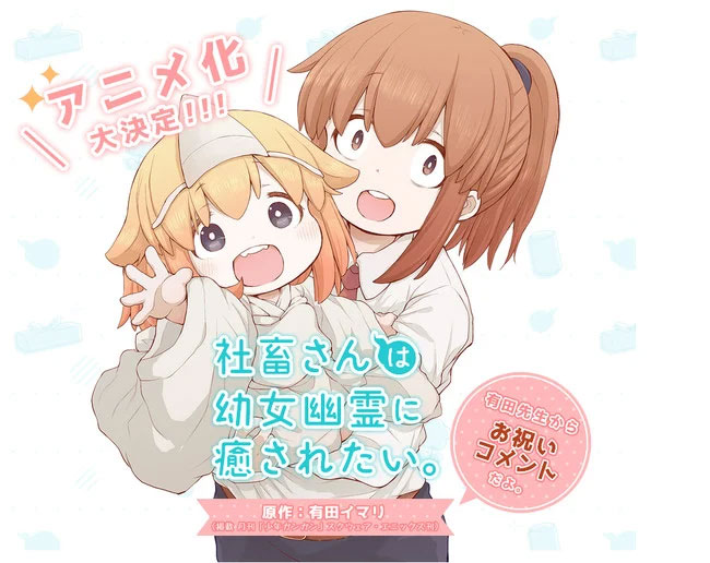 A través de la edición de julio de este año de la revista Shonen Gangan, se anunció que el manga Shachiku-san wa Youjo Yuurei ni Iyasaretai (The Company Slave Wants to Be Healed by a Little Ghost Girl) tendrá una adaptación al anime.