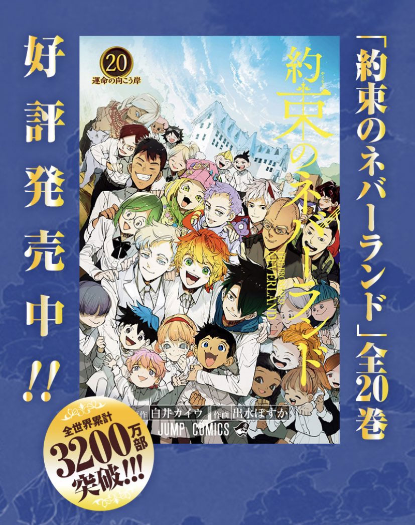 A través de una imagen promocional, se ha revelado que el manga Yakusoku no Neverland (The Promise Neverland) ha logrado alcanzar la cifra de 32 millones de copias en circulación. Esta cifra corresponde a las copias en circulación de los 20 volúmenes del manga original (incluyen las copias digitales y físicas) y también del spin-off de la franquicia titulado Oyakusoku no Neverland.