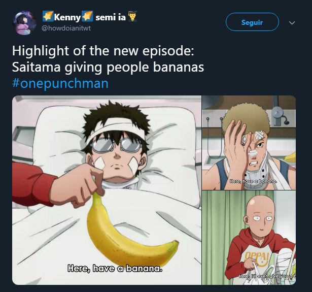 Otro usuario comentรณ: ยซLo mรกs destacable del nuevo episodio: Saitama regalando plรกtanos a las personasยป.