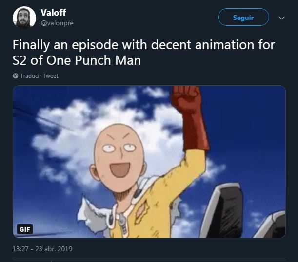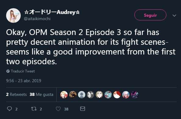La usuaria @aitakimochi, dijo: ยซDe acuerdo, el tercer episodio de la segunda temporada de One Punch Man tiene una animaciรณn bastante decente en sus escenas de peleas; parece una buena mejora con respecto a los dos primeros episodios.