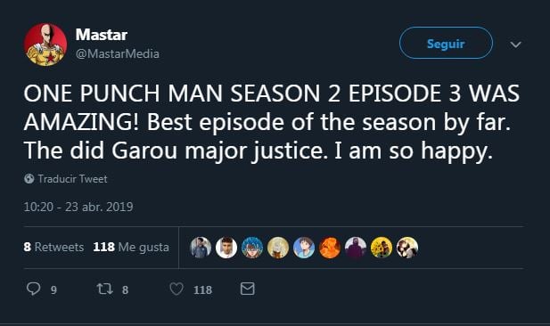 @MastarMedia, dijo:ยป EL TERCER EPISODIO DE LA SEGUNDA TEMPORA DE ONE PUNCH MAN ยกFUE INCREรBLE! El mejor episodio de la temporada por mucho. Hizo la mayor justicia de Garou. Estoy tan feliz.ยป.