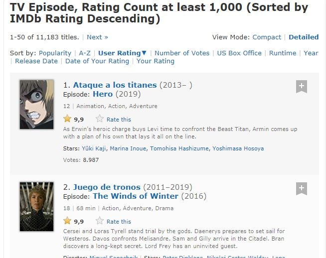 El episodio 54 de Shingeki no Kyojin es el mejor episodio valorado de la historia de IMDb, alcanzando durante unas horas la puntuación de 9.9.