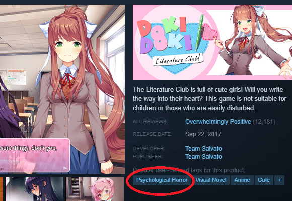 Sigue esto inmediatamente con la advertencia adicionalย ยซLas personas que sufren ansiedad o depresiรณn pueden no tener una experiencia segura jugando este juegoยป,ย y los jugadores deben hacer clic para aceptar / confirmar con una declaraciรณn que ยซAl jugar alย Doki Doki Literature Clubย , usted acepta que tienes al menos 13 aรฑos y aceptas que expongas contenido altamente perturbador ยซ. Tambiรฉn estรก el hecho de que en la pรกgina del juego en Steam, bajoยป etiquetas definidas por el usuario para este producto ยซ, la primera esย ยป psicolรณgica ยซ. horror.ยป