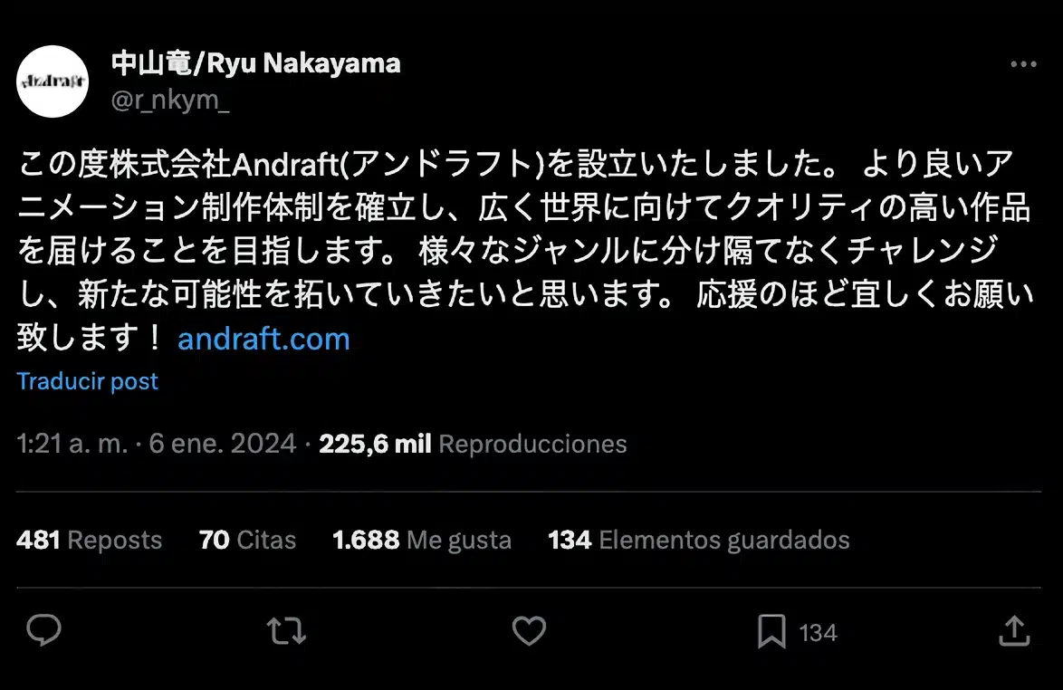 A travรฉs de un post en X antes conocido como Twitter, Ryu Nakayama exdirector de ยซChainsaw Manยป ha anunciado a sus seguidores que ha fundado un nuevo estudio llamado ยซAndraft Co., Ltd.ยป confirmado asรญ su rompimiento con MAPPA y cerrando la puerta a un nuevo proyecto de la historia de Denji con su direcciรณn. Algo que con la tibia aceptaciรณn de la obra en Japรณn se rumoraba que Ryu no estarรญa dirigiendo la nueva secuela ya anunciada en forma de largometraje.ย ย
