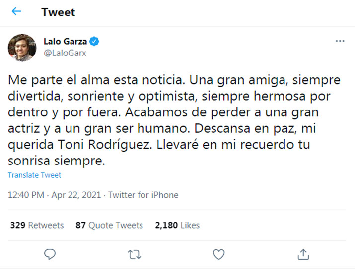 La noticia fue confirmada a través del twitter oficial del Actor de doblaje y director Lalo Garza, quién le ha dedicado unas palabras a su compañera y amiga.