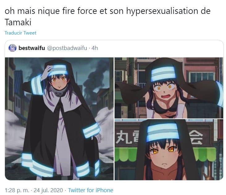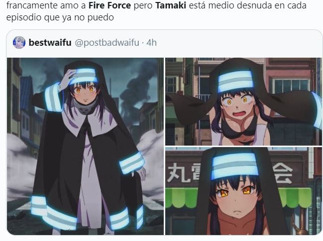 Yo la verdad si crítico la situación de Tamaki y mi problema no es el fanservice si no que hasta el momento parece que Tamaki lo único que hace es fanservice dando a entender como si fuera alguien inútil. Espero que en un futuro esto cambie y pongan una buena pelea de ella para que demuestre lo que vale para la fire force como lo han hecho con Maki.