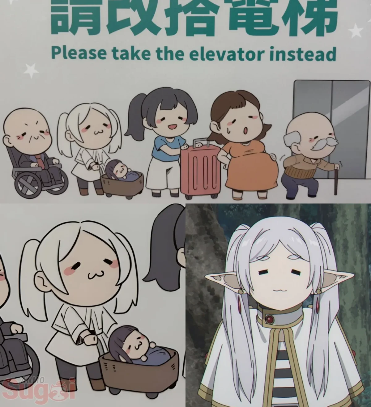 Recientemente, una imagen se ha vuelto viral mostrando una señalética que invita a los ciudadanos a utilizar el ascensor, donde una versión «chibi» de Frieren —acompañada de lo que parece ser una pequeña Fern en una canasta— encabeza la fila de personas que necesitan prioridad. Es el ejemplo perfecto de cómo el impacto cultural de una serie puede llegar a los lugares más cotidianos, demostrando que nuestra «abuela elfa» favorita siempre estará ahí para cuidarnos.