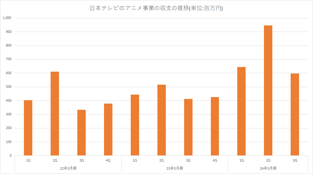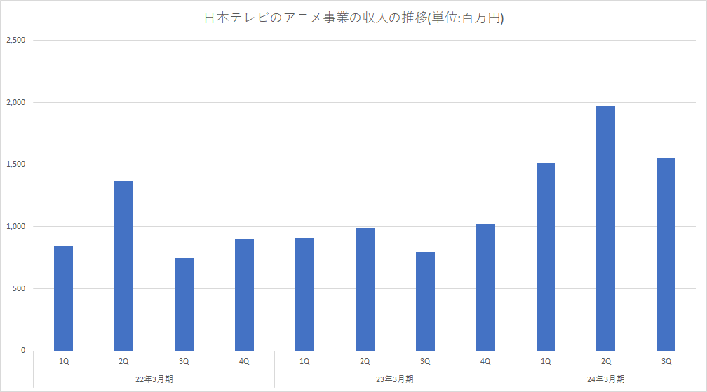 La importante cadena de televisiรณn japonesa ยซNippon TVยป ha revelado los datos de su informe financiero y de ganancias del tercer trimestre del aรฑo pasado con un impresionante y significativo aumento del 87% en ganancias, que equivalen a 5 mil millones en su divisiรณn de derechos de anime asรญ como un aumento de ventas por derechos del 59% equivalentes a 2 mil millones de yenes. La compaรฑรญa tambiรฉn informรณ de un aumento en el nรบmero de nuevos lanzamientos, la distribuciรณn de obras mรกs antiguas y que las ventas en el extranjero tambiรฉn fueron claves.