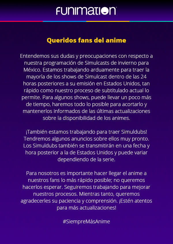 El servicio de streaming ยซFunimation Mexicoยป lanzรณ este comunicado debido a los problemas que estรกn teniendo los animes ยซSimulcastยป (Animes que se emiten al mismo tiempo que en Japรณn), dando una explicaciรณn a sus usuarios que estaban teniendo este problema con la plataforma.