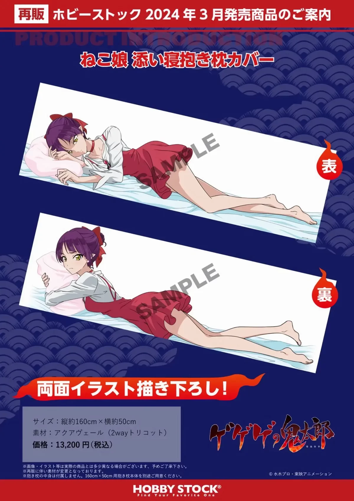 Las imágenes vistas en la almohada fueron elaboradas especialmente para este producto, las ilustraciones tenían como fin mostrar diferentes expresiones de Neko Musume, el tejido que se utilizó para elaborar el producto es «Aquaveil» (tricot de 2 vías), el cual se caracteriza por su fina textura, su tamaño es: Alto aproximadamente 160 cm x Ancho aproximadamente 50 cm, su precio es de 90.15 Dólares aproximadamente, su fecha de lanzamiento está prevista para marzo de 2024, las fechas de llegada así como las fechas para apartar el producto están por ser confirmadas.