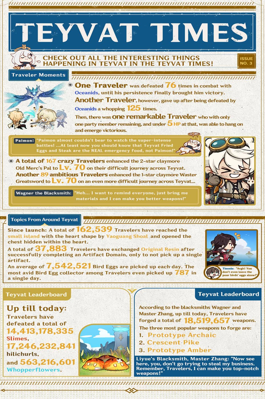 Paimon here, with Issue No. 3 of the Teyvat Times for ya! Be sure to read up on all the latest happenings in Teyvat today~
