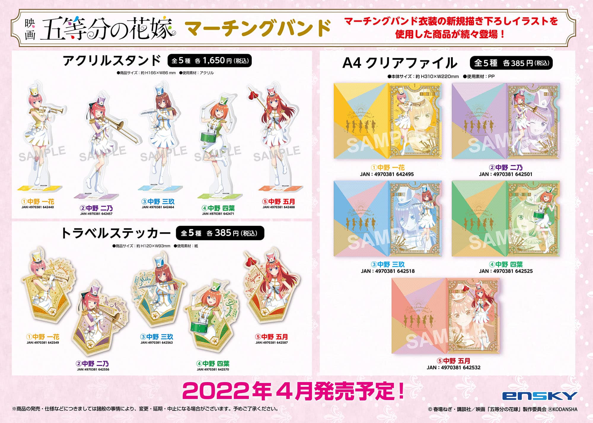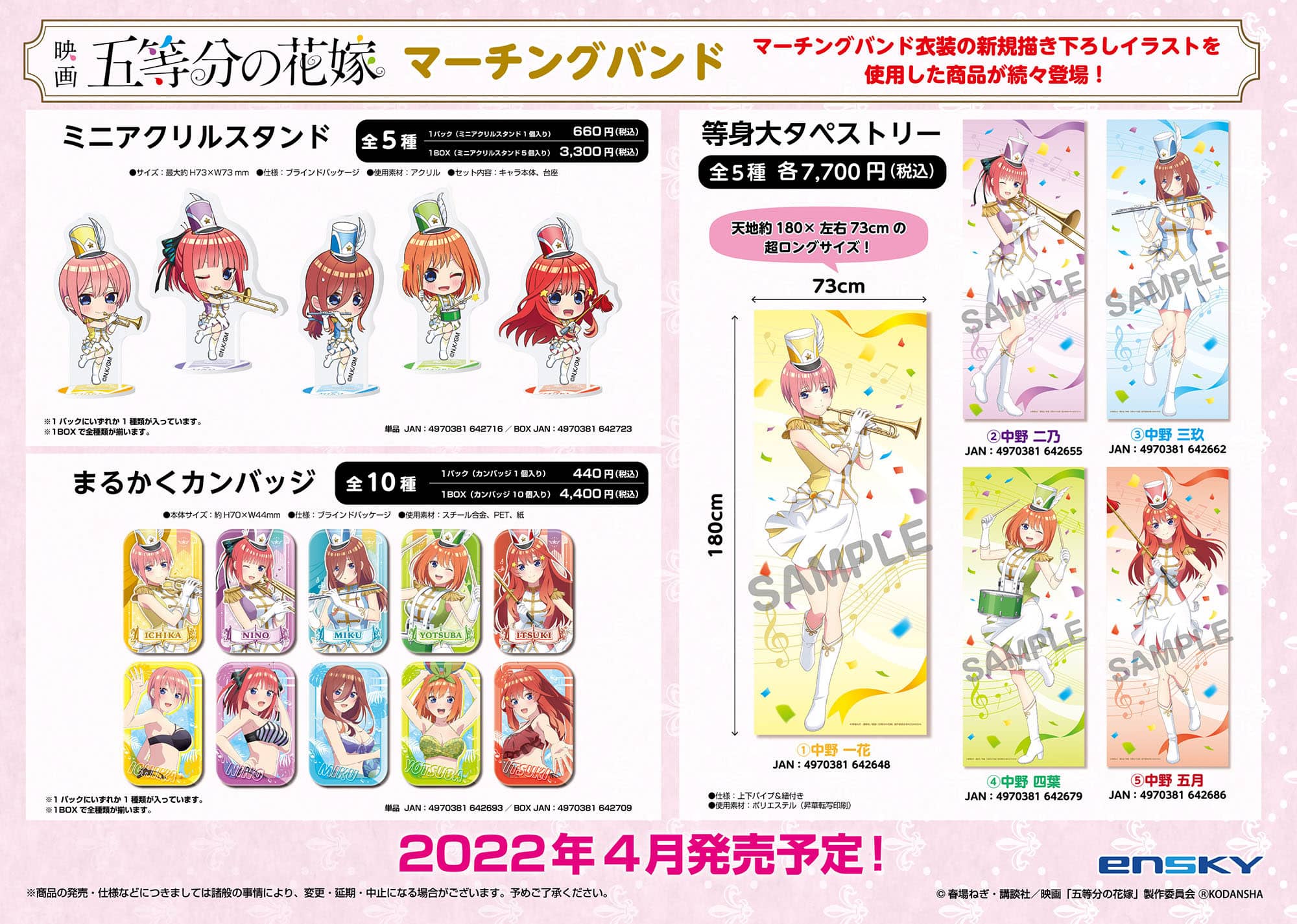 Cabe mencionar que la colaboración entre la compañía ENSKY y el anime Go-Toubun no Hanayome comenzará en el mes de abril de este año, y como se mencionó con anterioridad, se exhibirán diferentes productos inspirados en Miku, Nino, Yotsuba, Itsuki e Ichika, en donde lucirán unos trajes de banda de música para esta colaboración.