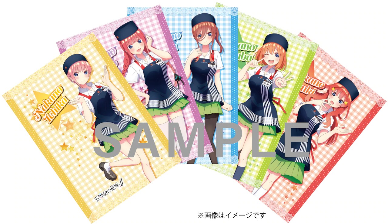 Las carpetas nos muestran a cada de una de las quintillizas luciendo el uniforme de Kappa Sushi. Simultáneamente se esta realizando una campaña en Twitter donde se podrá ganar una carpeta especial que incluye una ilustración de las quintillizas.