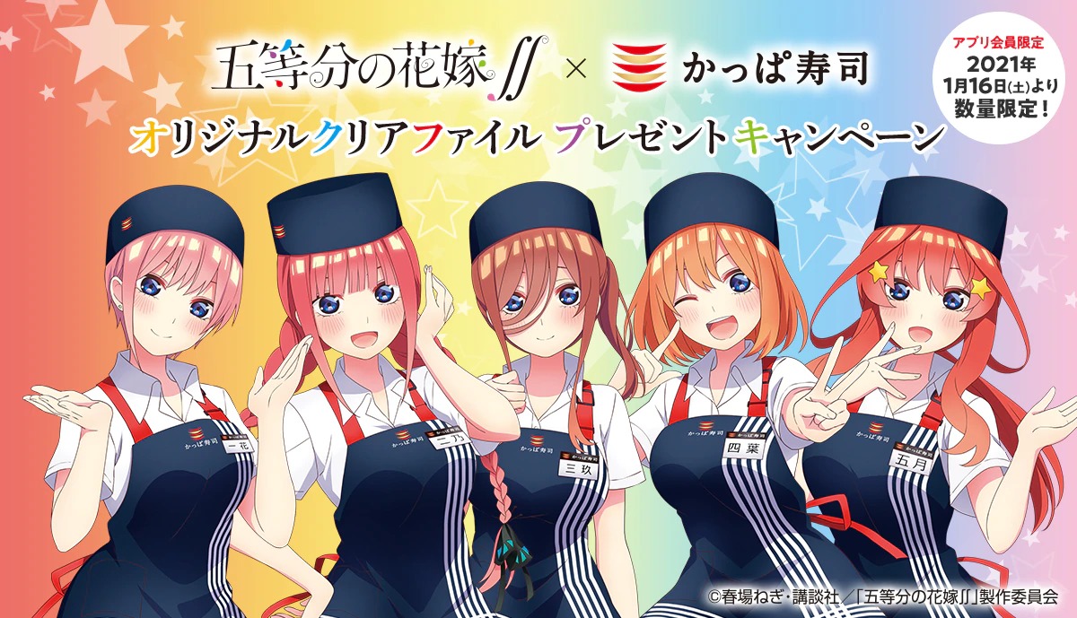 El sitio web oficial para la adaptación a anime del manga «Go-Toubun no Hanayome» (The Quintessential Quintuplets) anunció una colaboración con la cadena de restaurantes Kappa Sushi para conmemorar el estreno de la segunda temporada.
