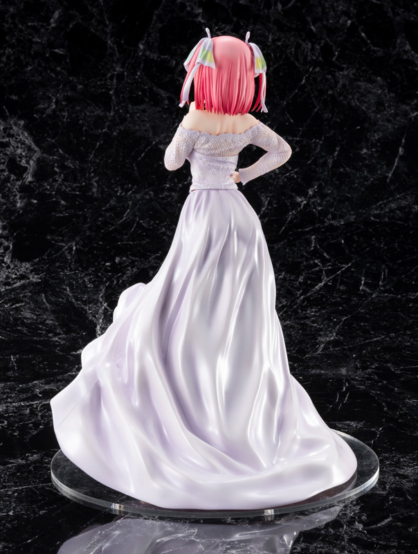 La figura nos presenta a la hermosa Nino Nakano luciendo un hermoso vestido blanco, los cuales hacen juego con el par de zapatillas blancas que usa Nino. La forma de las manos de nota una expresión un tanto encantadora como coqueta, poniendo su mano derecha en su cadera mientras que con la izquierda esta en su mejilla. Esta figura demuestra estar elaborada con materiales PVC de alta calidad.