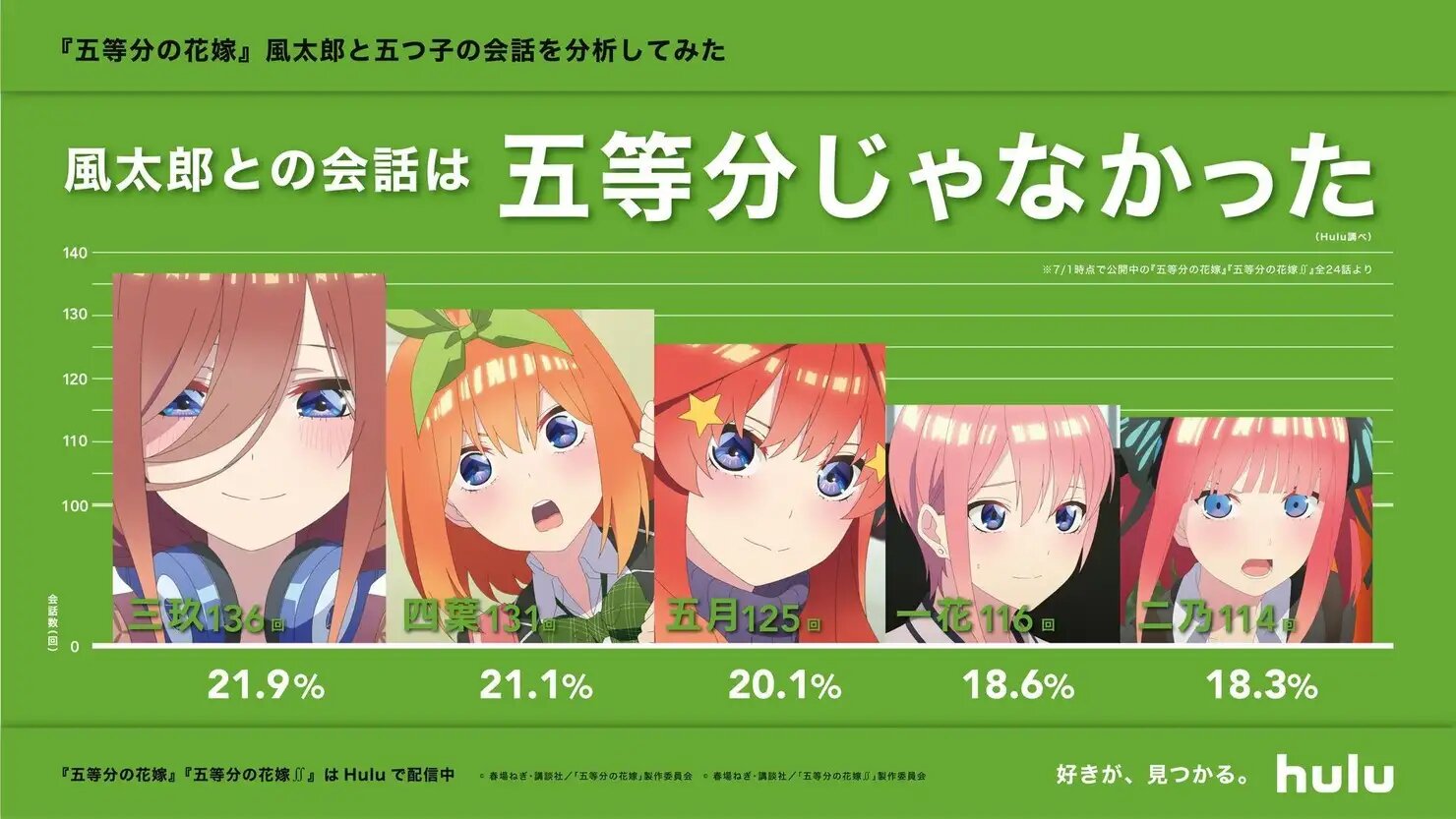 Tal y como muestran la gráfica, por muy poca diferencia con relación a Yotsuba, Miku Nakano en realidad es la chica que más cercanía tuvo con el protagonista durante la transmisión del anime.