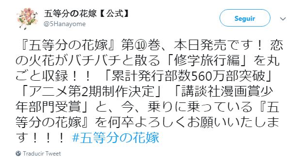 El día de hoy salió a la venta el décimo volumen del manga por lo que la cuenta oficial en Twitter de Go-Toubun no Hanayome anunció que ya está disponible a la venta, pero también reveló nuevas noticias sobre el manga.