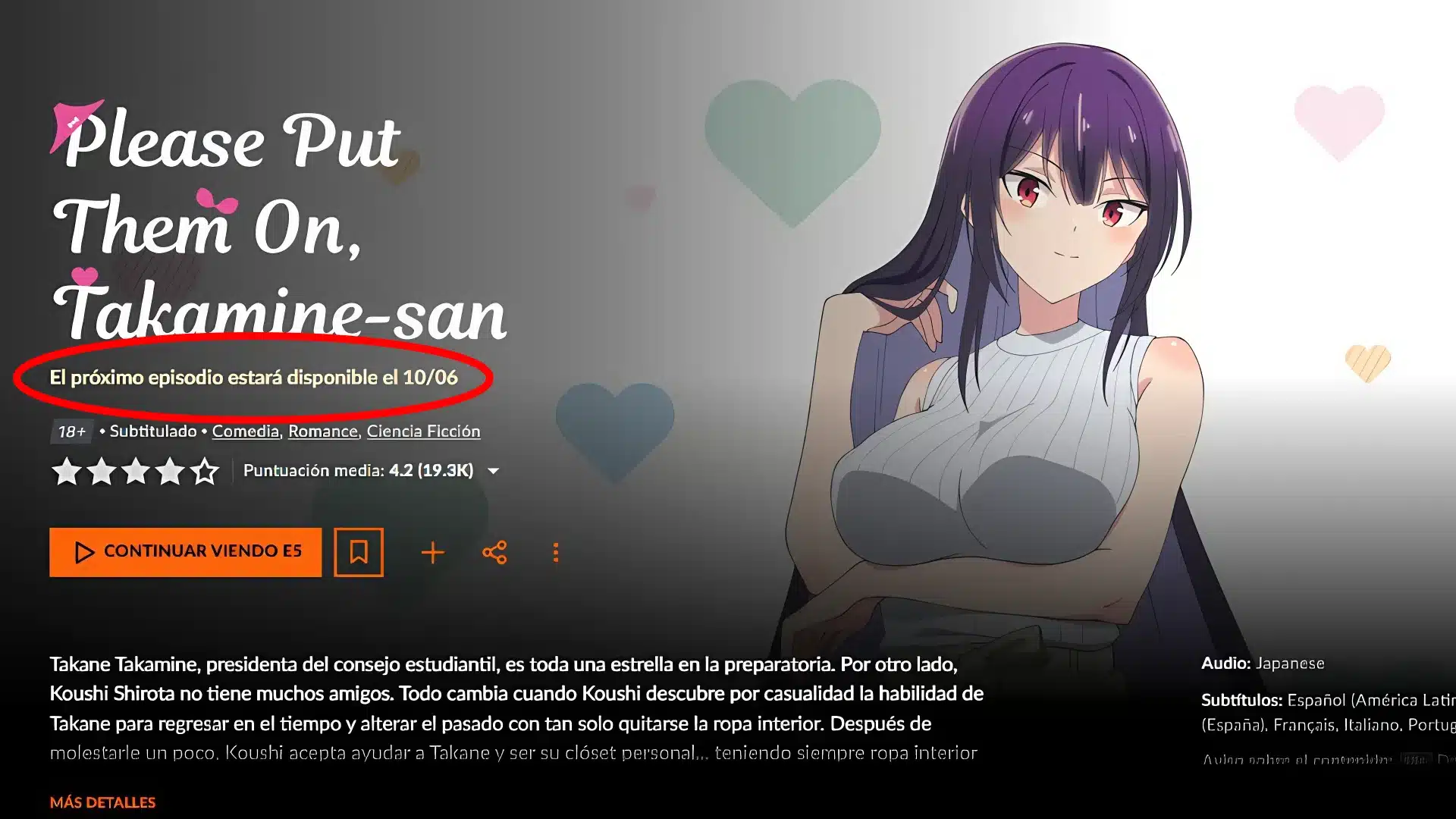 Luego de varias semanas consecutivas sin sufrir inconvenientes en su transmisión por Crunchyroll, el anime Haite Kudasai, Takamine-san (Please Put Them On, Takamine-san) volverá a experimentar un retraso en la publicación de uno de sus episodios en la plataforma.