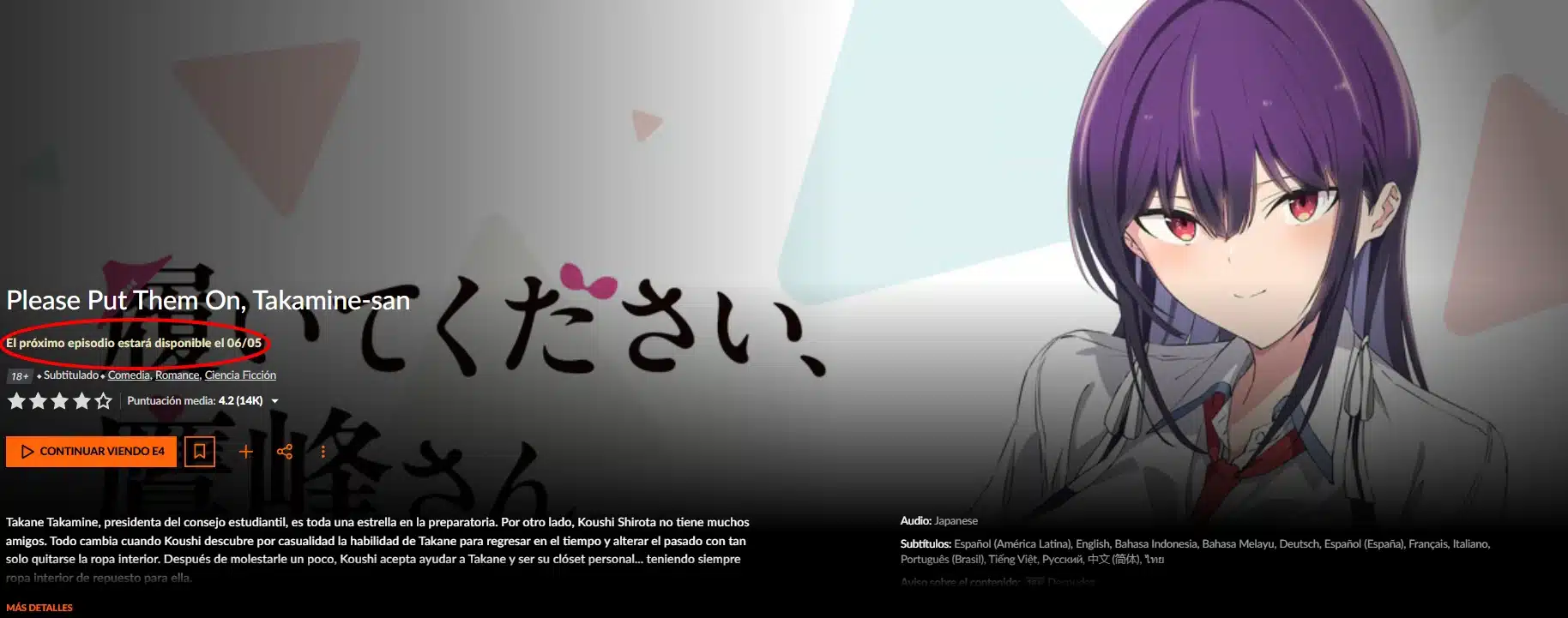 Un nuevo episodio del anime Haite Kudasai, Takamine-san (Please Put Them On, Takamine-san) volverá a sufrir un retraso en su estreno en la plataforma Crunchyroll. Según un aviso publicado en el apartado del anime Haite Kudasai, Takamine-san en Crunchyroll, el quinto episodio de la serie, que se estrenará este 30 de abril en Japón, estará disponible en la plataforma a partir del próximo 6 de mayo de este año.