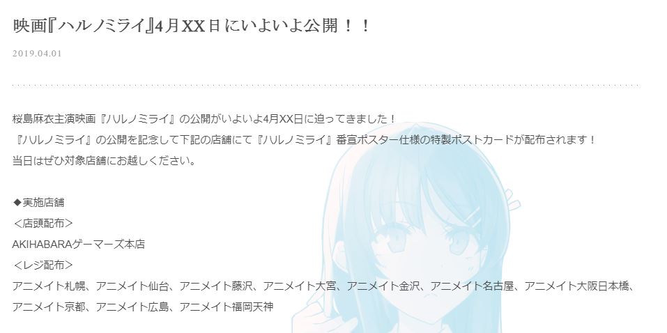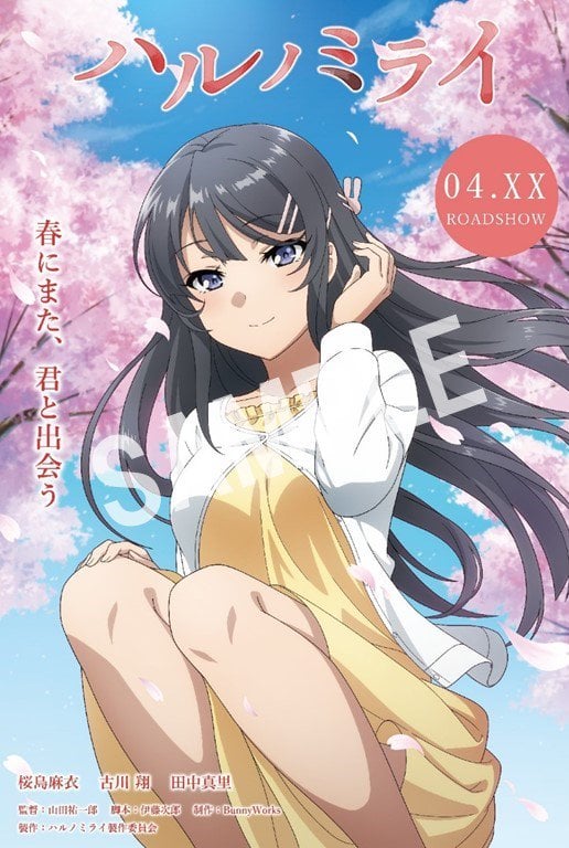 El sitio web de la adaptación anime de la novela ligera Seishun Buta Yarou wa Bunny Girl Senpai no Yume wo Minai (Rascal Does Not Dream of Bunny Girl Senpai) revelo el estreno de la película «Haru no mirai«, la nueva película protagonizada por la famosa actriz Mai Sakurajima. Le película supuestamente se estrenará el 20 de abril.
