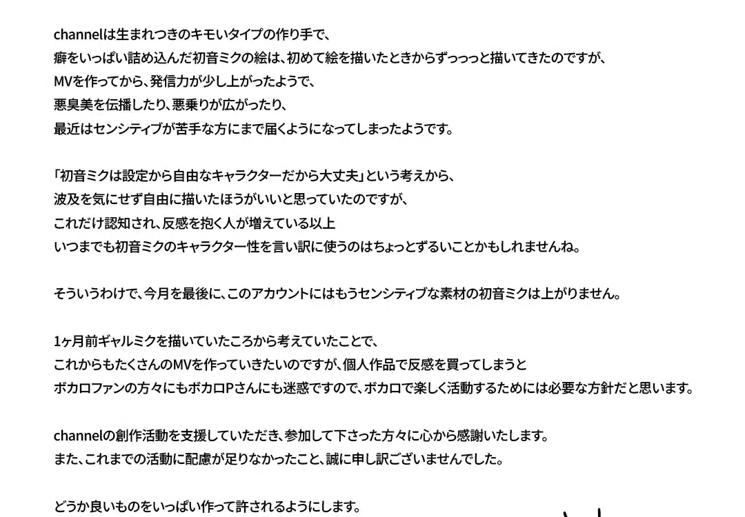 En la carta, channel habla sobre que siempre ha sentido una profunda conexiรณn con Hatsune Miku y ha disfrutado experimentando con su imagen de diversas maneras. Sin embargo, explica que ha llegado a la conclusiรณn de que es necesario encontrar un equilibrio entre su libertad creativa y el respeto hacia la comunidad que lo ha apoyado durante tanto tiempo, en ellos aquellos fans de Vocaloid. Y es que channel, tambiรฉn realiza videos de las Vocaloid, lo que ha hecho que tenga mรกs fans de esa comunidad.