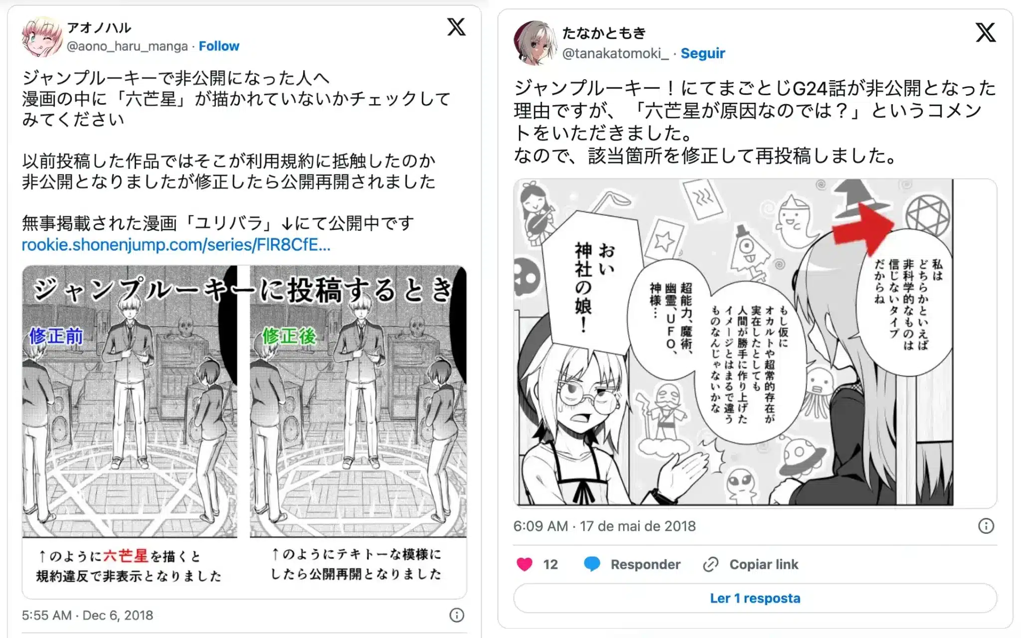 Pero este no fue el único incidente que este tipo, pues también otros mangakas informaron de problemas similares, todos ellos involucrados con la revista on line de Shueshia llamada «Jump Rookie«, en el primero podemos leer «Comprueben si hay hexagramas en su manga. Mi trabajo anterior parecía estar en conflicto con las directrices y debido a esto fue retirado de la lista, pero cuando lo corregí, se hizo público de nuevo.», mientras que en la segunda se lee «Cuando el capítulo 24 de mi manga en Jump Rookie dejó de estar en la lista, alguien comentó: «¿Será por el hexagrama?». Así que lo corregí y volví a subir el capítulo.»