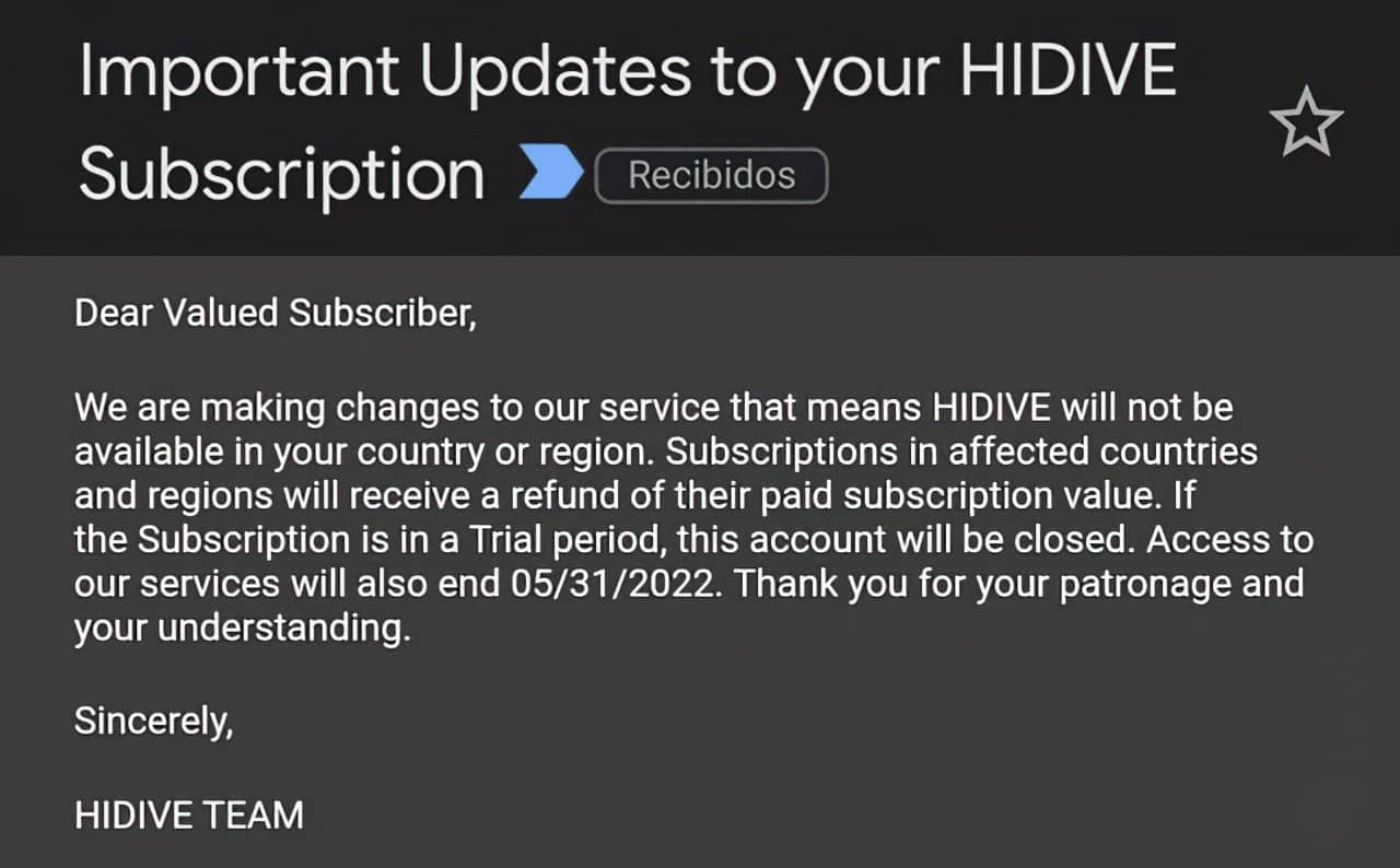 Recientemente, usuarios de la plataforma mencionaron que recibieron un correo por parte de la plataforma HiDive, donde señalaba que dejaría de estar disponible en su país a partir del 31 de mayo.