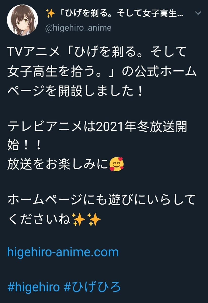 La cuenta oficial de Twitter para la adaptaciรณn al anime de las novelas ligeras Hige wo Soru. Soshite Joshikosei wo Hirou, escritas por Shimesaba e ilustradas por booota, revelรณ en una publicaciรณn que la serie se estrenarรก en invierno de 2021, aunque posteriormente fue eliminada la publicaciรณn.