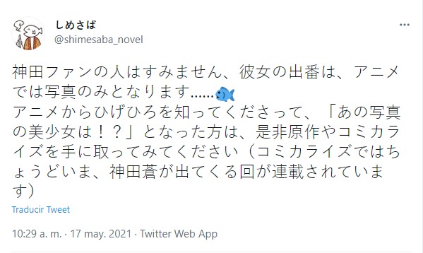 Si bien en el anime no se mostrará a Kanda, para buena fortuna de los fans y como el propio Shimesaba mencionó, actualmente se encuentra apareciendo en el manga donde tendrá mayor relevancia. A esto mismo hace mención Imaru Adachi, quien está a cargo de la adaptación al manga y comentó lo siguiente al respecto.