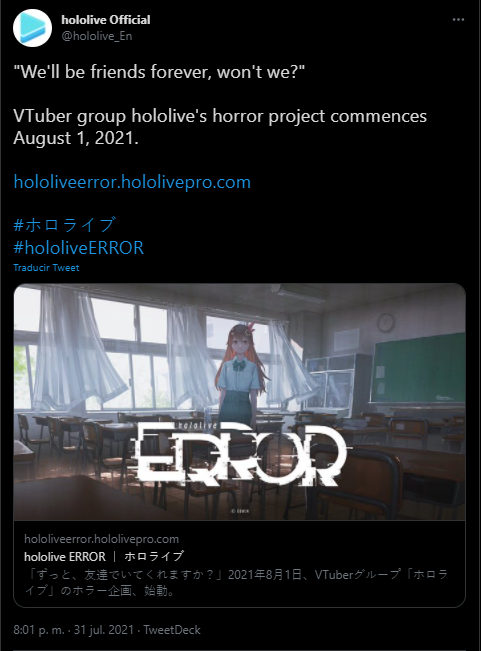 A travรฉs del Twitter de Hololive, se anunciรณ un nuevo video del reciente proyecto de la franquicia, titulado Hololive Error. El nuevo proyecto de horror comenzarรก en agosto de 2021.
