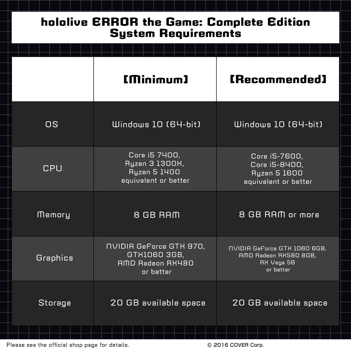A continuacion, las especificaciones minimas y recomendadas para jugar Hololive ERROR.