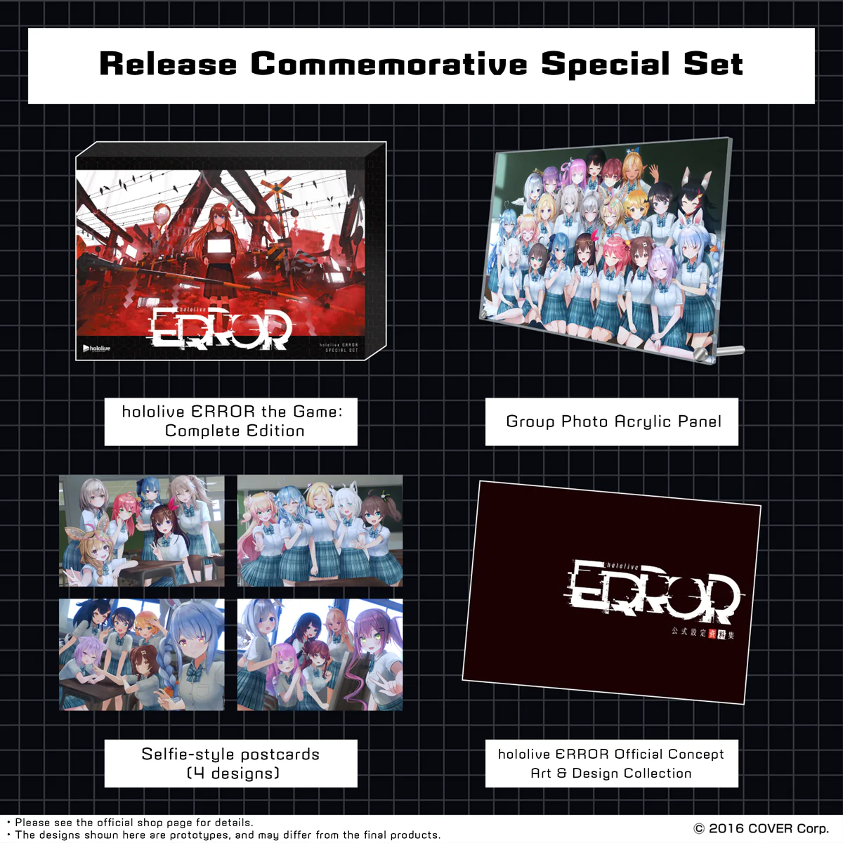 Hololive ERROR the Game: Complete Edition Release Commemorative Special Set: Contiene el juego completo, colección oficial de diseño y arte conceptual, panel acrílico de fotos grupales y postales estilo selfie (4 diseños diferentes) – Costo: 8,000 yenes (58 a 59 dólares aproximadamente).
