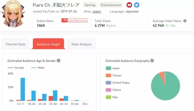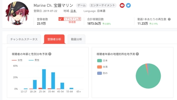 En el canal de Houshou Marine el rango de edades predominante en su público masculino abarca desde los 25 años hasta los 44. Por su parte, el público femenino es mucho más reducido y ronda los rango de edad mayormente de 25 a 34 años.