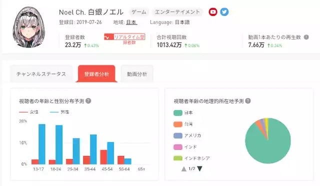Por otro lado tenemos a Shirogane Noel cuyo público predominante son los jóvenes de entre 13 a 24 años. Sin embargo, cabe destacar que entre las estadísticas reveladas ella es quien tiene el mayor porcentaje de espectadoras femeninas, las cuales abarcan una edad de 45 a 54 años mayormente.