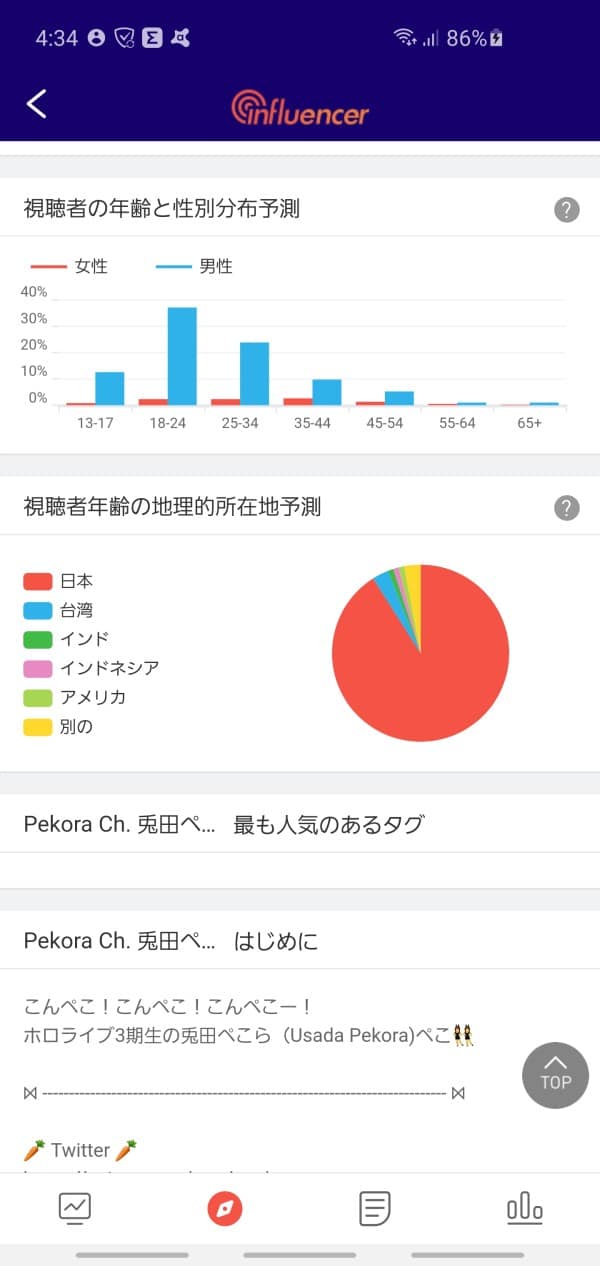 Finalmente tenemos a Usada Pekora, su audiencia principal son adultos varones de entre 18 y 24 años. Por su parte, a ella no le va también como a las anteriores en cuanto a público femenino, sin embargo este ronda un rango de edad de entre 18 a 44 siendo bastante parejo.