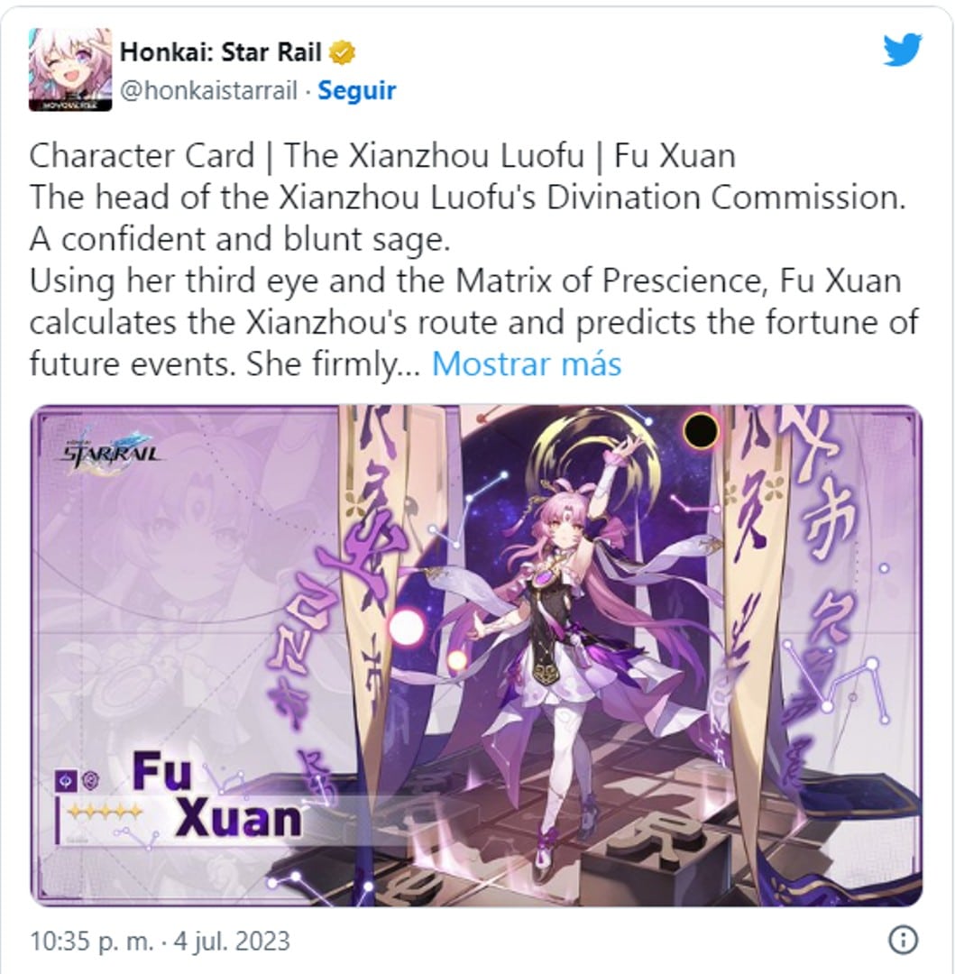 Gracias por la información adicional sobre Fu Xuan en Honkai: Star Rail. Es emocionante saber que usará ataques cuánticos y seguirá el camino de la preservación, lo que significa que se centrará en habilidades defensivas. Esto puede añadir una nueva dinámica estratégica al juego y ofrecer a los jugadores opciones diferentes para su estilo de juego. Además, destacando el hecho que será un personaje de 5 estrellas.
