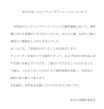 La cuenta oficial de Twitter del anime Hoshiai no Soraย emitiรณ un comunicado en el que se disculpan por mostrar en el ending los bailes de Miko Nanakawa y Melochin sin un permiso. Ademรกs, el comunicado tambiรฉn indicรณ que los dos bailarines ahora estรกn trabajando con el equipo de anime.