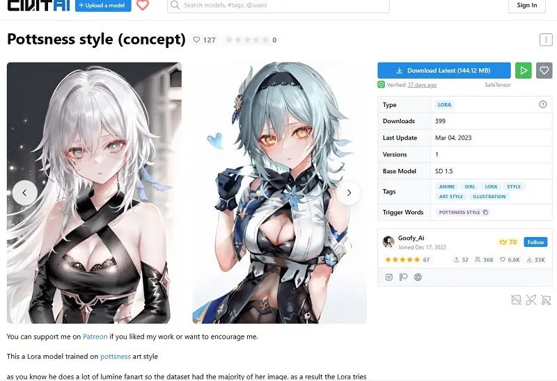 Puedes apoyarme en Patreon si te gusta mi trabajo y quieres animarme, esta es una modelo de Lora entrenada al estilo de Pottsness. Como saben, hace mucho fanart de Lumine (de Genshin Impact).