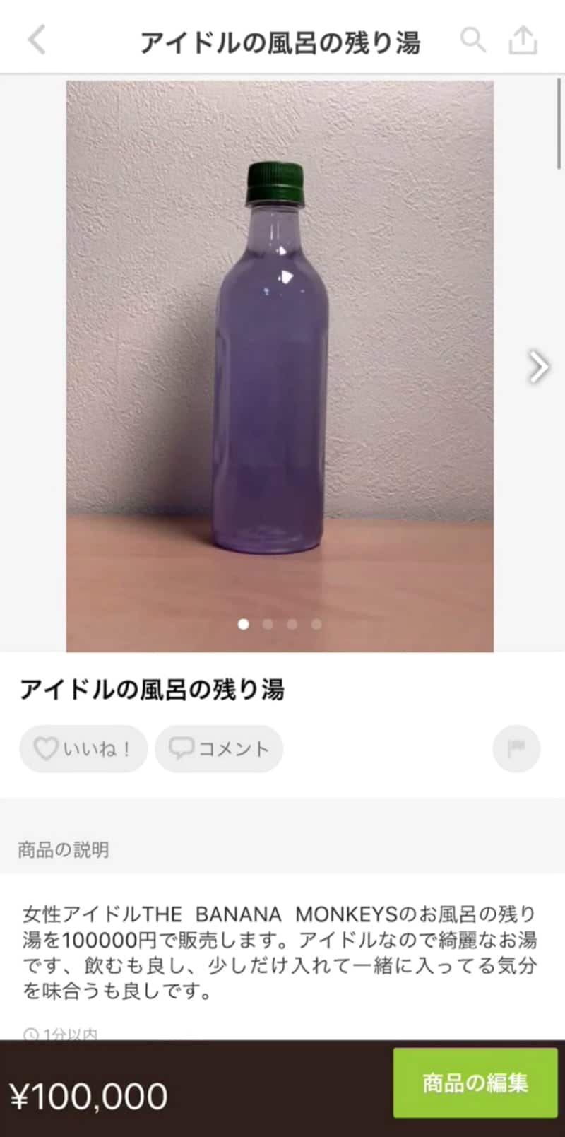 El agua utilizada fue vendida en botellas por medio del sitio web Mercari, a un «humilde» precio de 100 mil yenes (900 dolares).