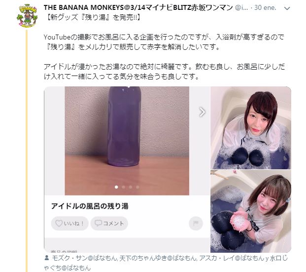 El grupo de idols The Banana Monkeys publicaron un vídeo donde dos chicas se meten en una tina y comienzan a jugar y hacer todo tipo de bromas. Al final se nos muestra que el agua utilizada para bañarse sera vendida en botellas. aunque pareciera parte de las bromas realizadas, resulto ser real.