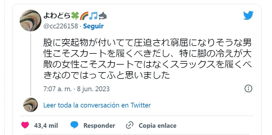 Muchos hemos visto tanto en animes como en caricaturas que las faldas al parecer son cómodas, lo cual no hace ver más lindos y sentirnos más ligeros siendo hombres. Con respecto a esto, al parecer extrañamente se hizo popular un tweet donde el usuario よわどら (@cc226158) argumenta de que los hombres son los que deberían usar faldas y las mujeres pantalones.