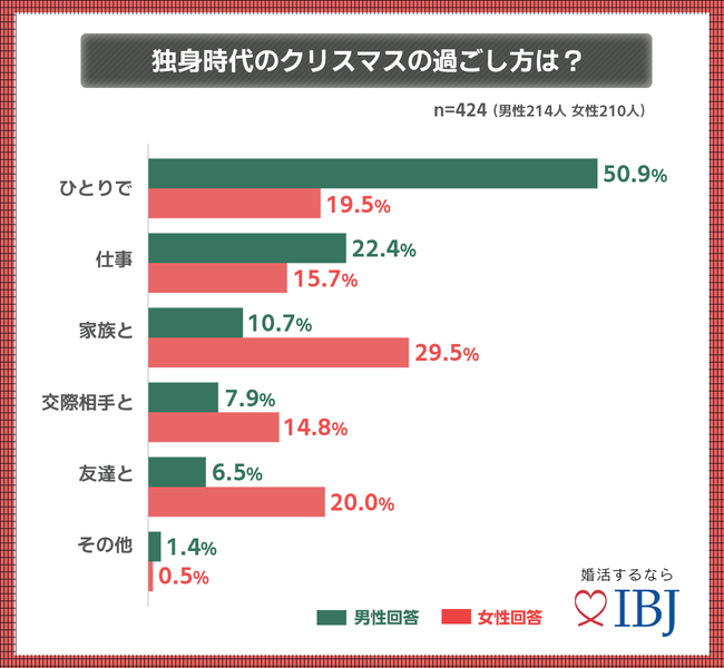 Mediante una encuesta realizada por la compañía que ofrece servicios de emparejamiento IB Japan, se dio a conocer que un 50.9% de hombres solteros en Japón pasaron las fiestas navideñas solos, mientras que las mujeres solteras que la pasaron de manera solitaria fueron un escaso 19.5%. La encuesta consta con una muestra de 424 datos, 214 opiniones de hombres y 210 opiniones de mujeres.