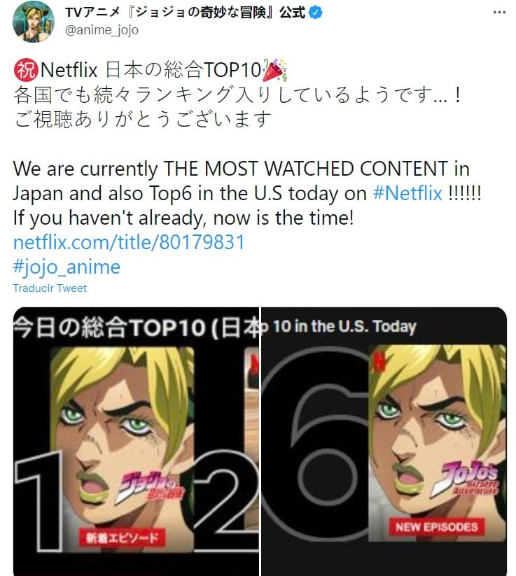La plataforma de streaming Netflix reveló que la adaptación al anime de la sexta parte del anime Jojo’s Bizarre Adventure, titulada «Jojo’s Bizarre Adventure: Stone Ocean«, es el título más visto del momento en Japón y es el sexto título más visto en Los Estados Unidos.